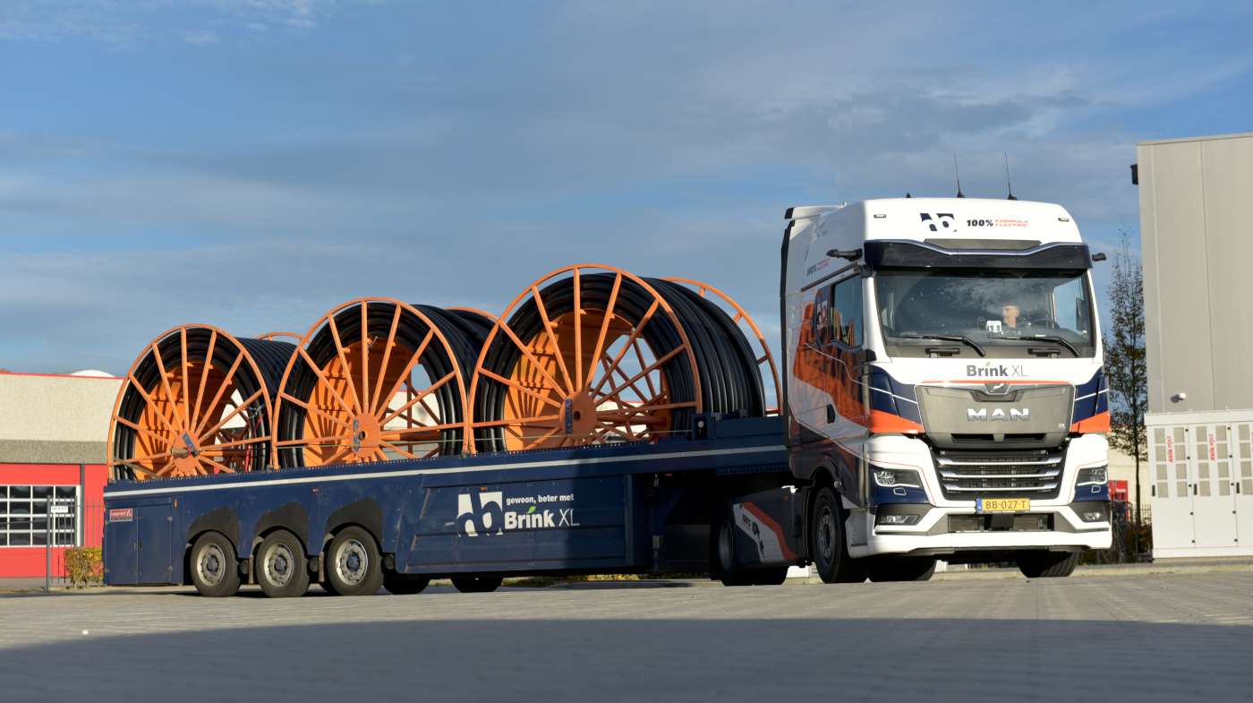 Brink is bijzonder gecharmeerd van het concept van de elektrische MAN-trucks. “Met name de compacte bouw, de 3,75 meter korte wielbasis en de grote actieradius van 500 kilometer maken de eTGX tot de ideale truck voor onze inzet. Dankzij de ruime GX-cabine en alle comfort aan boord is de chauffeur ook erg enthousiast over de truck. Deze trekker rijdt met een dieplader voor het vervoer van haspels”, aldus Henk Brink.